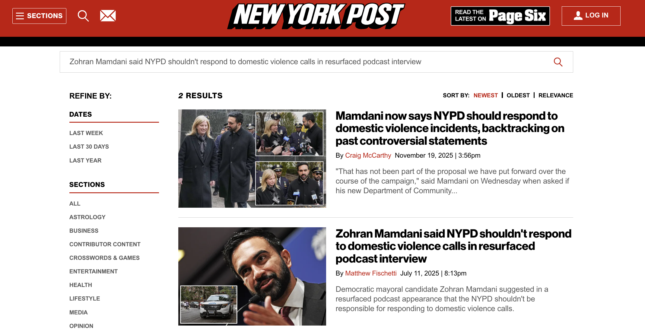 Mamdani's campaign website said (archived here) that the new department will be used "to prevent violence before it happens by prioritizing solutions which have been consistently shown to improve safety." A more detailed description of that proposal (archived here) did not say that his administration plans not to respond to domestic violence calls.