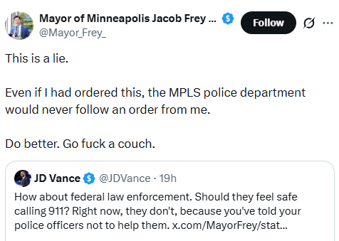 Did Minneapolis Mayor Jacob Frey tell Vice President J.D. Vance to "go fuck a couch" in an X post? No, that's not true: Vance did quote a real post from Frey on X in a discussion about law enforcement and other people needing to feel safe calling 911, but the reply suggesting intercourse with a piece of furniture came from a parody account. The parody label was not immediately visible to all users due to the layout of X on certain screen sizes.